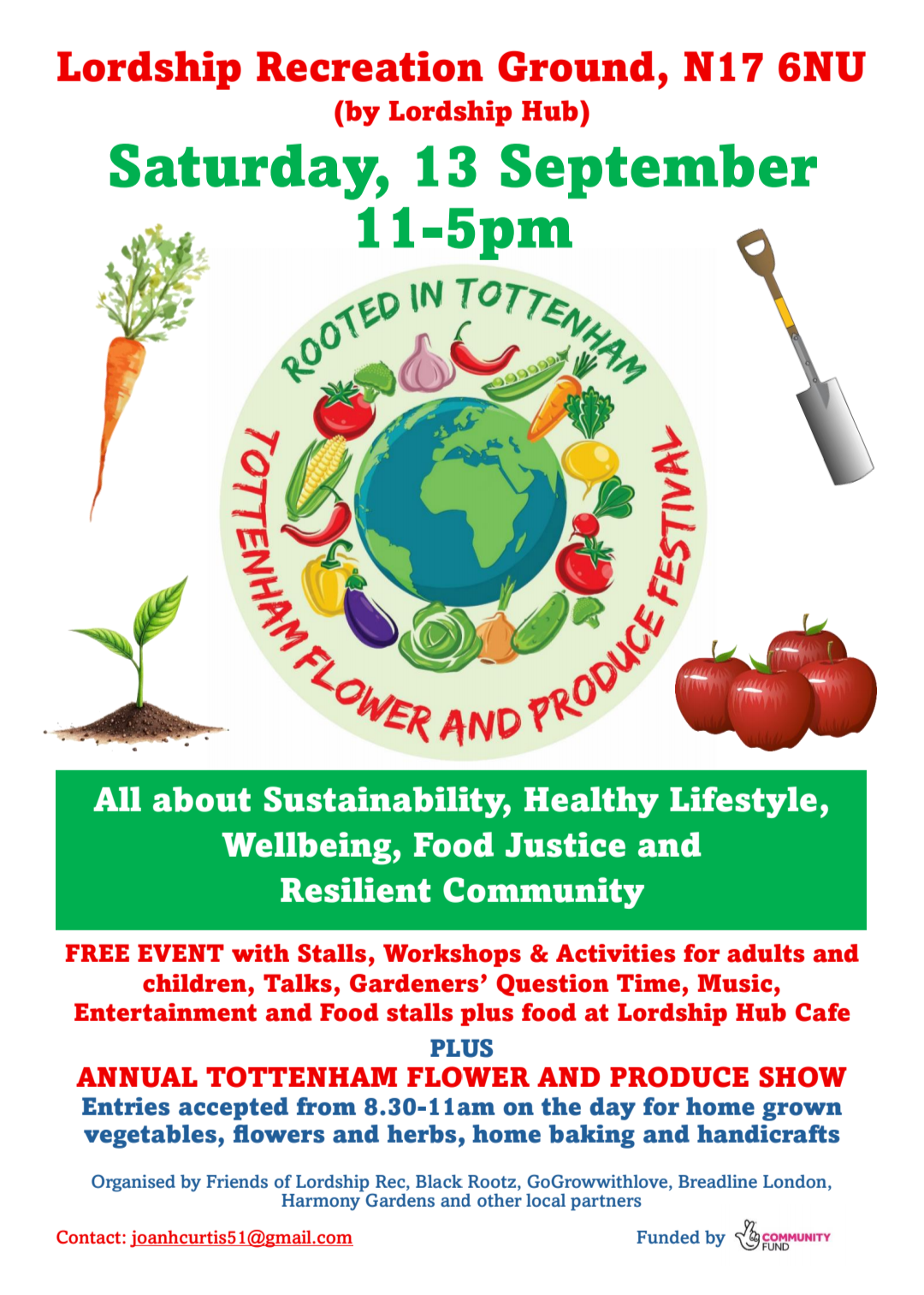 Part of Rooted in Tottenham – Tottenham Flower and Produce Festival and partfunded by National lottery Community Fund.