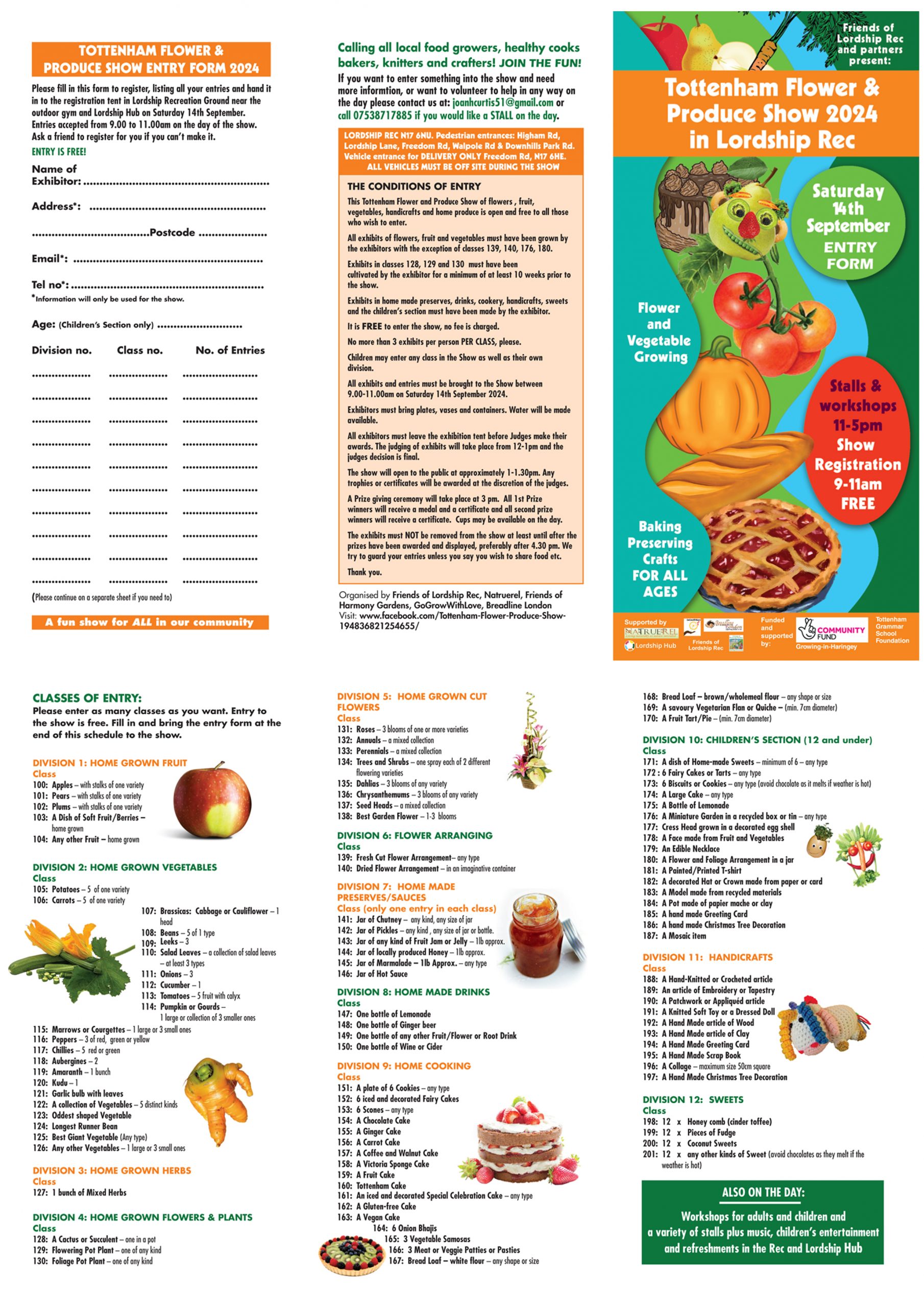 To enter items into the Tottenham Flower and Produce Show pick up an entry form from Lordship Hub